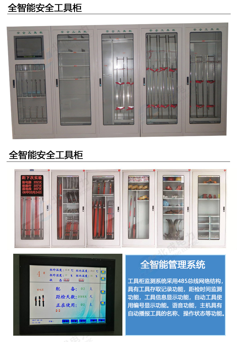 全智能工具柜一般是組合柜,三個工具柜或三個工具柜以上一組,每個工具柜內安有多個探頭,臺柜子上有一個大的LED顯示屏,可以隨時顯示柜內溫度濕度以及柜內每種安全工器具的試驗周期,還顯示使用中絕緣工具的使用數量和編號,絕緣工具拿出使用時柜內開啟識別系統(tǒng),自動監(jiān)視絕緣工具使用情況,絕緣工具復位后,自動關閉顯示窗口,恢復工器具試驗周期倒計時狀態(tài)。全智能工具柜具有對絕緣工具進行標識和分類管理的功能,能夠識別工具是否放錯了位置,并提醒工具檢驗時間。全智能工具柜微電腦控制,數控兼容,內采用冷凝型除濕機,類似小型空調,控溫除濕,保證絕緣工具使用時更安全。